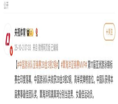 据@央视体育 消息,第11届亚洲游泳锦标赛在印度落幕,中国游泳队共收获28金3银2铜,高举奖牌榜首位。中国队获得本届赛事最佳团队奖,覃海洋和龚真琦分别当选男、女最佳运动员。