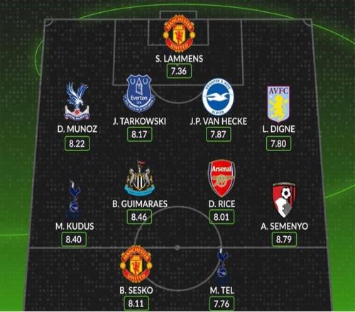 外媒评英超第7轮最佳阵容:曼联、热刺两人入选,赖斯在列