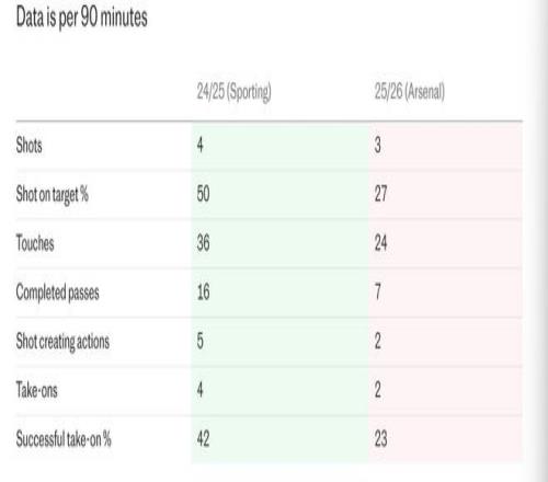 在最基本的层面上,哲凯赖什在阿森纳的触球机会比在葡萄牙体育时少。在所有比赛中,他每90分钟的触球次数从上赛季的36次下降到本赛季至今的24次。