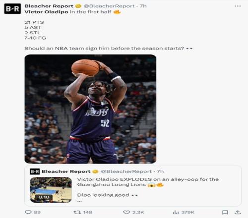 就在他上半场拿到21分+完成单臂空接暴扣后,美国媒体BR写道:有一支NBA球队在新赛季正式开启前有意签下他吗?(这个言论实际上算间接举荐奥迪了,因为这个状态真的比很多现役球员更好。)