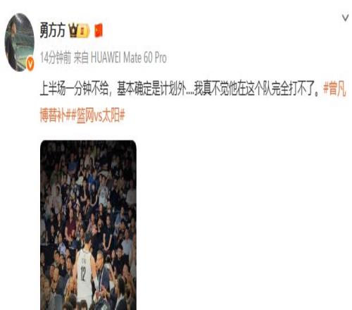 北京媒体人“勇方方”评论表示:上半场一分钟不给,基本确定是计划外.,我真不觉他在这个队完全打不了。